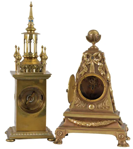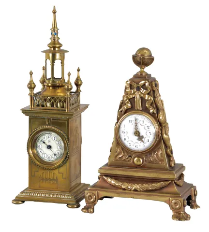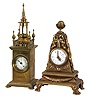 (1) The case is in very good overall condition with some small dents to the edges. Jewels in spire have been reset. The dial and beveled glass are in excellent condition The clock ticks, but was not tested long term. (2) The case is in good condition Gold plate is uneven. The dial has many hairline cracks around the number 9 and is loose. Movement winds and ticks, but was not tested long term. Sold "as is".