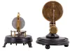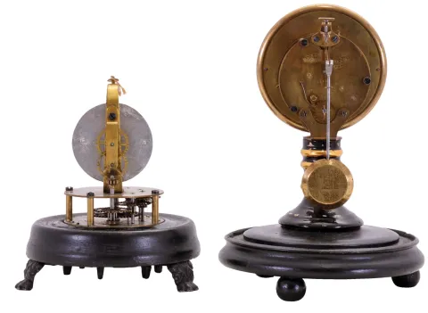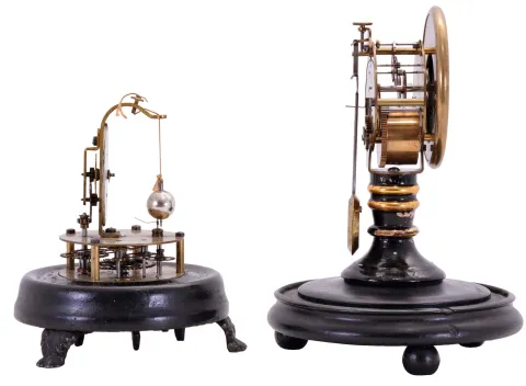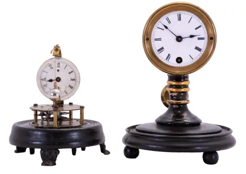 Clocks- 2 (Two): (1) E. N. Welch Mfg. Co., Briggs Rotary Model No. 3, 30 hour, spring driven movement rotary pendulum novelty timepiece; (2) Seth Thomas' Sons, New York, New York, 14 day, spring driven movement candlestick timepiece. (1) Original painted wood base has some minor loss in the groove for the dome. It looks like a small piece of sheet tin has been placed behind the original dial pan. The brass dial bezel is missing. The paper dial looks to be original with stains and abrasions. Minute hand is missing; (2) Original wood base looks it may have been repainted at one time. The base also has dings on the edge. The candlestick has some scattered loss. Original porcelain dial has a slight damage at the winding arbor. Original hands. Pendulum is original to the movement. With domes