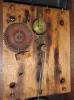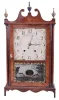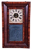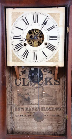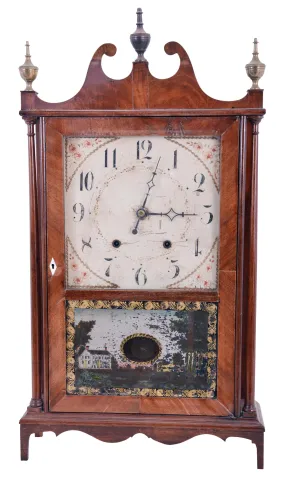 Clocks- 2 (Two): (1) E. Terry & Sons, Plymouth, Conn., 30 hour, time and strike weight wood movement pillar & scroll shelf clock, c1825; (2) New Haven Clock Co., New Haven, Conn., 30 hour, time and strike, weight driven brass movement OG shelf clock, c1855 (1) Mahogany & mahogany veneered case has repairs to both scrolls. The feet, front skirt and center cross strip have been replaced. Original painted dial is soiled and worn with scattered paint loss. Original hands. Original tablet has significant loss, but restorable. Finials are replacements. Dust panel on the back of the case is missing. Dark, stained label inside. (2) Mahogany and rosewood veneered case in original finish has some loss on the front band corners. Original painted dial is nice for its age. Minute hand is a replacement. Period mirror, but perhaps not original. Clean label inside. Measurement for the largest clock.