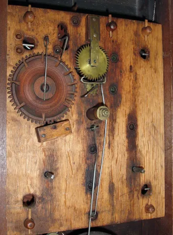 Clocks- 2 (Two): (1) E. Terry & Sons, Plymouth, Conn., 30 hour, time and strike weight wood movement pillar & scroll shelf clock, c1825; (2) New Haven Clock Co., New Haven, Conn., 30 hour, time and strike, weight driven brass movement OG shelf clock,