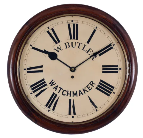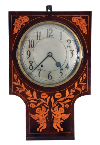Clocks- 2 (Two): (1) English, 8 day, spring fusee brass movement postal or wall timepiece, c1890; (2) French, 8 day, time and strike spring driven movement inlayed wall clock, c1840 (1) Refinished oak case in nice condition. Original painted dial has been repainted and has some paint lifting near 12 o'clock. The box behind the dial has been replaced. Original hands. The movement is stamped "R M S" with a rose engraved above the letters. (2) Inlayed mahogany case in an old finish has a couple seam cracks in the veneer at the top corners. Silvered engraved brass dial in nice condition. Original hands.