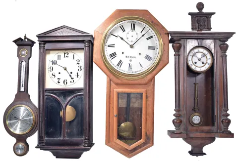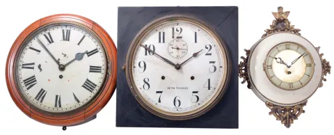 Clocks- 6 (Six) spring driven wall and one barometer: (1) Seth Thomas "World" 15 day duration; (2) German box clock time and strike; (3) German R/A time and strike; (4) Astral, Coventry English postal clock; (5) Seth Thomas lobby clock 15 day duration; (6