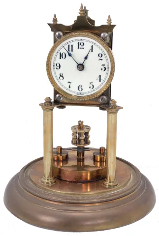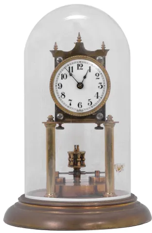 Clocks- 12 (twelve) German 400-day mantel and 1 (one) Barr electro-mechanical clock under glass dome. The standout clock is the c. 1900 400-day clock with disc pendulum. 5 (Five) of the clocks have domes and all have pendulums. The Barr pendulum and second hand are absent. Sold "as is".