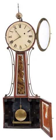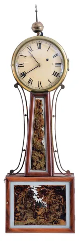 Unsigned New Hampshire or Massachusetts 8 day, weight driven, brass movement Patent or banjo timepiece. Refinished mahogany case has had some restoration. Someone in an attempt to tighten up the bottom box put screws into the glue blocks and filled the holes. There is a shrinkage crack in the head. The small wires that hold the throat glass at the bottom are missing. Both tablets are replaced. Original dial plate has been repainted. Hands and side arms are replacements. Movement is attached to the case with a screw through the backboard. The original latch for the bottom door has been replaced with a hook latch.
