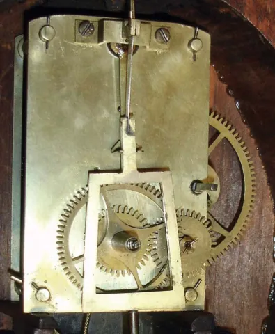 Refinished mahogany case has had some restoration. Someone in an attempt to tighten up the bottom box put screws into the glue blocks and filled the holes. There is a shrinkage crack in the head. The small wires that hold the throat glass at the bottom are missing. Both tablets are replaced. Original dial plate has been repainted. Hands and side arms are replacements. Movement is attached to the case with a screw through the backboard. The original latch for the bottom door has been replaced with a hook latch.