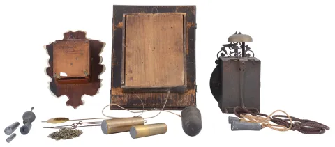 Clocks- 3 (Three): (1) a diminutive Morbier movement in sheet iron case, Roman numeral enamel dial, 30 hour, weight driven time and alarm movement; (2) a German picture frame clock, ebonized frame, stamped brass dial surround with Gothic arches and musicians, Roman numeral white enamel dial, 30 hour, weight driven time, strike, and alarm movement; (3) German shield clock, porcelain front with enamel landscape and foliate ornament, Roman numeral white enamel dial, 30 hour, spring driven time and strike movement, dimensions of picture frame clock listed (1) Morbier dirty, bell replaced, will tick; (2) picture frame clock case with splits and break, dial surround dirty, replaced weights, chains may or may not be correct, pendulum replaced; (3) shield clock missing pendulum and side door, dial with chips, will tick, striking not functional, all clocks will need restoration