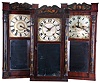 (1) Mahogany and mahogany veneered case in original finish has a small chip and repair on the base, a repair on the middle cross strip and on the top strip. Mirror is a replacement. Dial glass is broken. Original painted dial has scattered paint loss. Original stenciling on the columns and splat. Original hands; (2) Mahogany and mahogany veneered case in original finish has a small chip on the base and some damage to the edges of the chimney caps. Original stenciling on the columns and splat. Original painted dial, hands and mirror. Clean label inside the case; (3) Mahogany & mahogany veneered case in original finish has veneer loss on the base and bottom right block. Original stenciling on the columns and splat. Original mirror is damaged on one edge. Original painted dial and hands. Most of the label is gone.