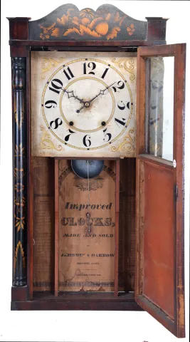 Clocks- 3 (Three): (1) Orrin Hart, Bristol, Conn., 30 hour, time and strike weight "groaner" wood movement half column & splat shelf clock, c1830; (2) Jeromes & Darrow, Bristol, Conn., 30 hour, time and strike weight wood movement half column & splat
