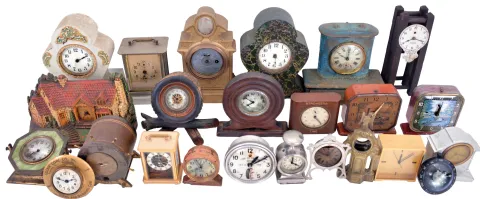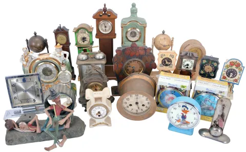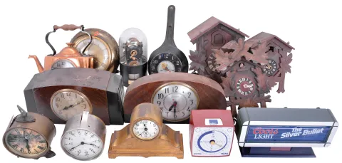 Clocks- 50+ (Fifty plus) Novelty Clocks and Clock-related Sundries: Makers include: Lux, Telechron, Kroeber, Sessions, Howard Miller, Gruen, Deluxe, Waltham, Seth Thomas, Ansonia, Schatz, United, and many others. Sundry items include ashtrays, cologne