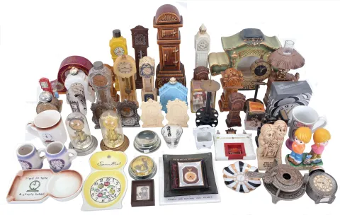 Clocks- 50+ (Fifty plus) Novelty Clocks and Clock-related Sundries: Makers include: Lux, Telechron, Kroeber, Sessions, Howard Miller, Gruen, Deluxe, Waltham, Seth Thomas, Ansonia, Schatz, United, and many others. Sundry items include ashtrays, cologne bottles, salt & pepper shakers, mugs, shot glasses, statuettes, trivets, lamps, spoon holders, match holders, paperweights, and bookends. sold "as is".