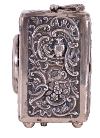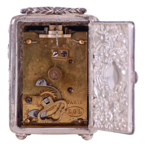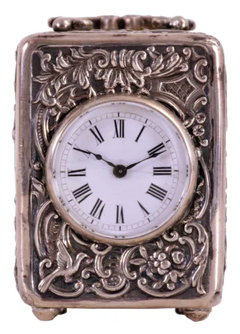France, small carriage clock, the silver case with repousse ornament in the rococo style, Roman numeral white enamel dial, blued steel hands, 8 day timepiece movement with lever platform