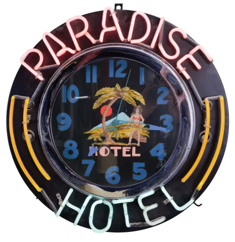 "Paradise Hotel" three color neon electric wall clock, time only, with sweep seconds hand the clock is operational, keeps time and all the neon tubes are intact. The dial has been touched up. The presence of three neon colors is unusual and makes for a great effect.