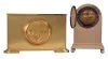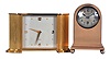 Clocks- 2 (Two): Both Chelsea, the first a "Doric" model, polished case on a molded base with ball feet, 2 1/2" silvered dial, signed "Theodore B. Starr Inc., New York", 8 day timepiece movement with lever escapement, serial #62988, the other a "Wisteria", gilt case with engraved decoration, silvered dial with Arabic numeral and dot markers, gilt dauphine hands, and 8 day timepiece movement with lever escapement, Wisteria dimensions listed Doric polished, dial with a minor marks at 6:00, running, Wisteria with minor dirt and tarnish at base, otherwise good, running