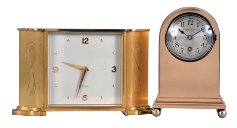 Clocks- 2 (Two): Both Chelsea, the first a "Doric" model, polished case on a molded base with ball feet, 2 1/2" silvered dial, signed "Theodore B. Starr Inc., New York", 8 day timepiece movement with lever escapement, serial #62988, the other a "Wisteria"