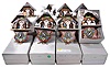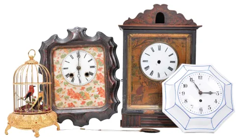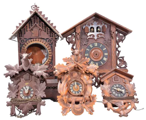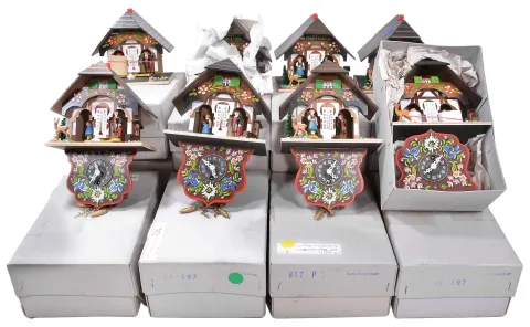Clocks- 30 (Thirty) approximately German, Black Forest and Reproduction: including 20 (Twenty) modern German barometer, thermometer, clock combination in the form of a Swiss chalet, time and strike wooden works wag on wall, shelf cuckoo case only, Cuckoo and Quail wall clock American Cuckoo Clock Co., German porcelain wall clock and several modern and parts cuckoos, The lot includes a reproduction cast iron bank with soccer theme and a double singing bird in cage by Reuge. sold "as is".