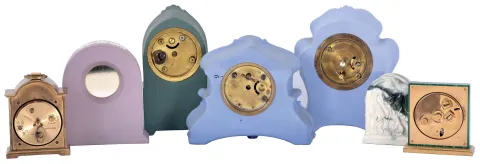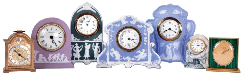 Clocks- 7 (Seven): Four with decorated jasper cases, one marked "Wedgwood", a "Luxor" with faux malachite case, an "Aynsley" with marbled Portlandware case, and a "Swiza" alarm in bracket clock form, mechanical and quartz movements, 20th century