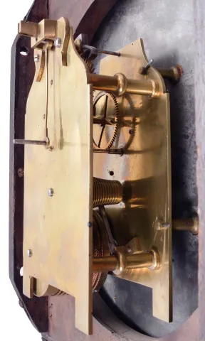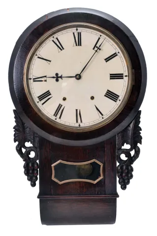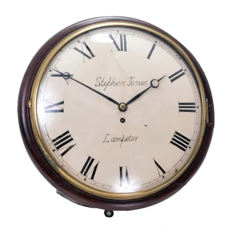 Clocks- 3 (Three) English & Anglo-American: (1) English, 8 day time only dial clock with robust spring driven movement fusee movement in a walnut case with painted metal dial signed "Stephen Jones, Lampeter" (Wales) ; (2) Anglo-American, 8 day time and strike, spring driven movement in a carved walnut case; (3) Anglo-American, 8 day time and strike, spring driven movement in a rosewood veneer case. (1) The dial appears repainted. The brass bezel has some tarnished areas. The wood bezel surround and case have some spits and small losses. Missing door latch; (2) Nicely carved case front. The side door has been repaired with a wooden cigar box panel. The painted metal dial is starting to flake. Movement is likely a New Haven as it has a New Haven pendulum; (3) The case has some veneer loss. The dial is a paper replacement. Side door is missing. Dimensions provided are for the veneer cased clock. Sold "as is".