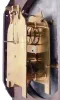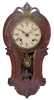(1) The dial appears repainted. The brass bezel has some tarnished areas. The wood bezel surround and case have some spits and small losses. Missing door latch; (2) Nicely carved case front. The side door has been repaired with a wooden cigar box panel. The painted metal dial is starting to flake. Movement is likely a New Haven as it has a New Haven pendulum; (3) The case has some veneer loss. The dial is a paper replacement. Side door is missing. Dimensions provided are for the veneer cased clock. Sold "as is".