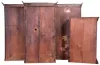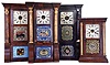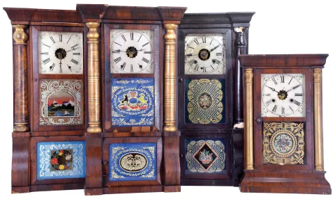 (1) The cornice parts need to be reglued and the cornice mounted on the case. There is some veneer damage along the base. The case retains some original finish. The dial and hands are period. The two door glasses are very nice with some loss to the middle glass; (2) The gilt columns have been painted. The finish is original. There are numerous veneer chips along the top and bottom of the case. The dial and hands are period; (3) There is veneer damage in several areas. The dial and hands are original. The door glasses are all original with some paint loss on the center glass; (4) The original finish has been over coated with a darker stain or finish. There are some areas of veneer chipping. The columns have finish damage at the top and bottom areas. The dial and hands are original, though the dial has considerable loss. The door glasses are original and in excellent condition. The dimensions are for clock number 3.