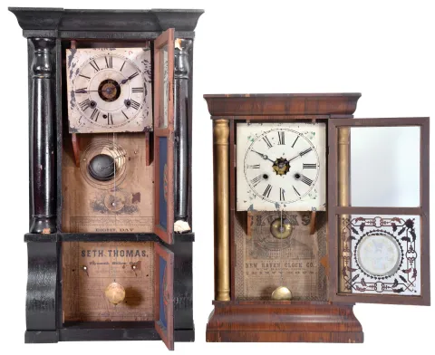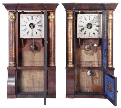 Clocks- 4 (Four) (1) Wm. L. Gilbert & Co., Winsted, Conn. Cornice and Column shelf clock with a weight driven 8 day, time and strike movement in a rosewood veneered case, c1865; (2) New Haven Clock Co., New Haven, Conn. Cornice and Column shelf clock with