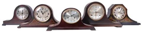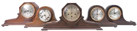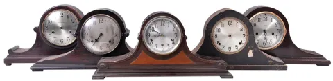 Clocks- 21 (Twenty-One) tambour and round-top mantel clocks and one (1) tambour case: clocks include time and strike as well as five; (5) chime clocks. Makers include Ansonia, Seth Thomas, Ingraham, Gilbert, etc.