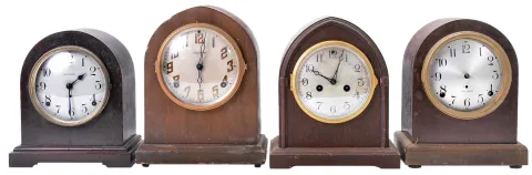 Clocks- 21 (Twenty-One) tambour and round-top mantel clocks and one (1) tambour case: clocks include time and strike as well as five; (5) chime clocks. Makers include Ansonia, Seth Thomas, Ingraham, Gilbert, etc. sold "as is".