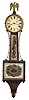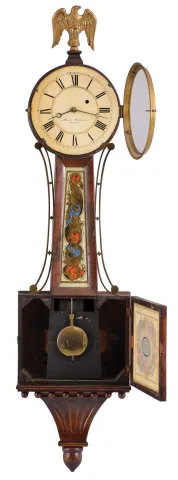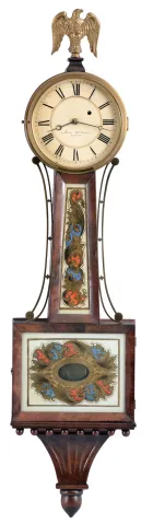 Massachusetts, 8 day, time and strike, weight driven brass movement Patent or banjo timepiece. Refinished mahogany and mahogany veneered case has a rough edge on the bottom edge of the bottom door. Painted dial has original paint with an attempted repair to the gold chapter ring and the number 12. The dial looks to be original although there are other holes in the head. The signature is spurious. Both tablets look to be later replacements. Period hands. The dial door glass is missing. The latch to the bottom door looks like the type used by the North Attleboro makers. The movement is attached to the case with a screw through the backboard.