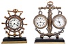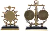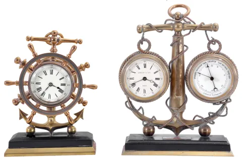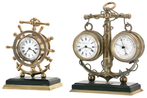 Clocks- 2 (Two): Both with nautical theme, the first signed "Lawson & Son Paris", brass trimmed, black slate base supporting a brass anchor encircled by rope, and with 8 day timepiece and barometer, both with white enamel dials, and rectangular plaque