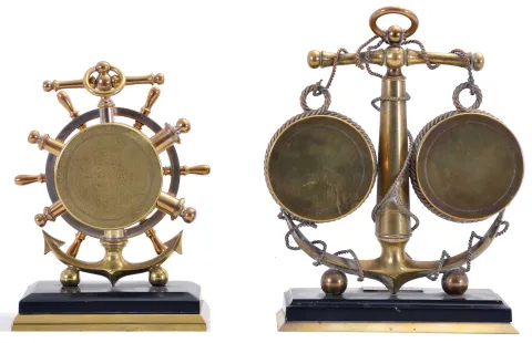 Clocks- 2 (Two): Both with nautical theme, the first signed "Lawson & Son Paris", brass trimmed, black slate base supporting a brass anchor encircled by rope, and with 8 day timepiece and barometer, both with white enamel dials, and rectangular plaque engraved "Vigilant", the other also with brass trimmed, black slate base supporting a brass anchor and 8 day timepiece with white enamel dial, the bezel with ships wheel surround, dimensions of larger piece listed slate with minor flakes, engraved plaque replaced, polish residue, brass with minor bends, timepiece - barometer missing thermometer, Lawson running, the other with good staff