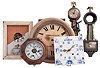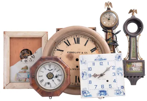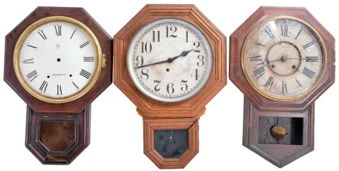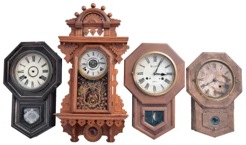 Clocks- 15 (Fifteen) and 5 (Five) case only, all wall hanging: 8 (Eight) short drop octagon including a New Haven with rosewood veneer, Ansonia "Regulator A", Russel & Jones, Pittsfield, Mass. (successors to Terry Clock Co.) hanging gingerbread in oak with alarm, New Haven marine octagon, partial banjo case with Waltham movement also including three banjo case only, miniature banjo case only and a gallery clock case only sold "as is". The New Haven and the Russel & Jones are in above average condition and are the highlights of lot.