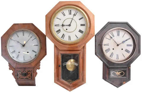 Clocks- 15 (Fifteen) and 5 (Five) case only, all wall hanging: 8 (Eight) short drop octagon including a New Haven with rosewood veneer, Ansonia "Regulator A", Russel & Jones, Pittsfield, Mass. (successors to Terry Clock Co.) hanging gingerbread in oak
