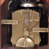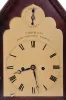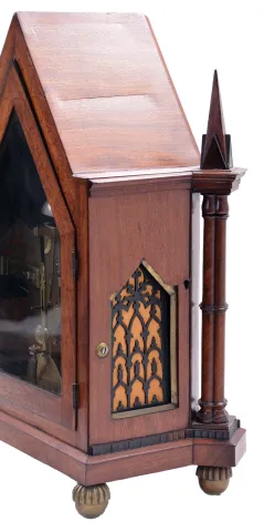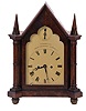 Mahogany & mahogany veneered case in an old finish. There are a couple small shrinkage cracks on the peaked roof of the case. The tip on the right spire has been repaired. Original dial has been repainted now with some flaking on the lower left corner. Hands original. A very nice heavy plate fusee brass movement with pull repeat.
