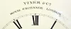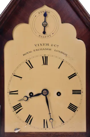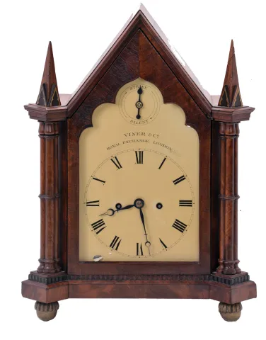 English, Viner & Co., Royal Exchange, London, 8 day, time and strike spring fusee movement Gothic style bracket clock. Mahogany & mahogany veneered case in an old finish. There are a couple small shrinkage cracks on the peaked roof of the case. The tip on the right spire has been repaired. Original dial has been repainted now with some flaking on the lower left corner. Hands original. A very nice heavy plate fusee brass movement with pull repeat.