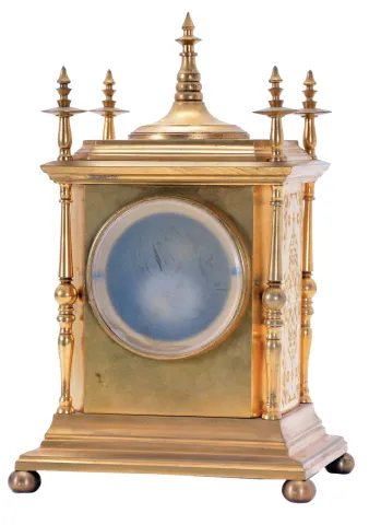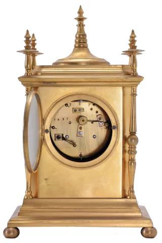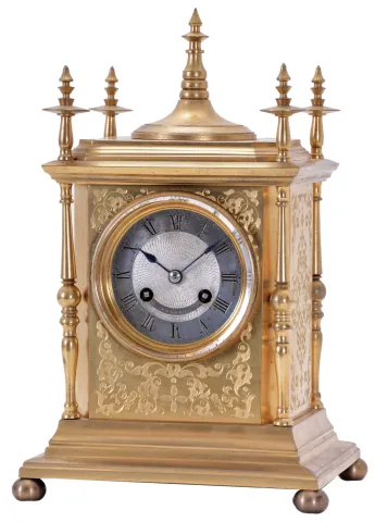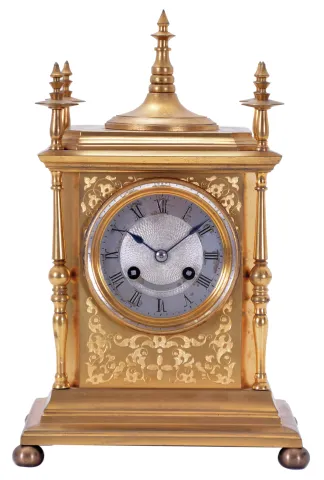 France,. for J.W. Benson, London, shelf or table clock, gilt case with Arabesque ornament, slender columns, and turned finials, Roman numeral, engine turned, silvered dial, blued steel spade hands, 8 day, time and strike pendule de Paris movement with