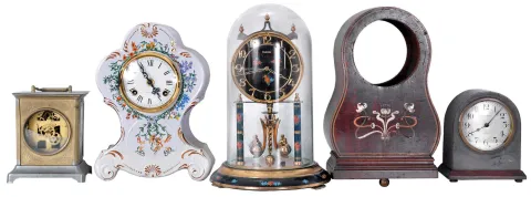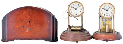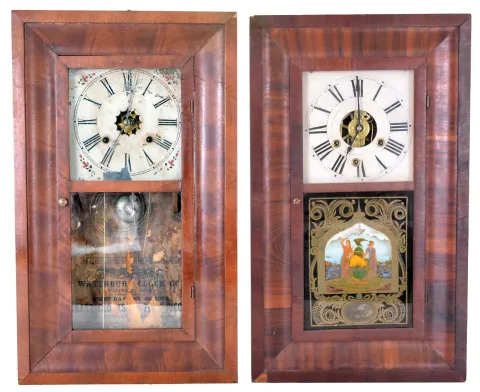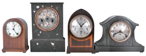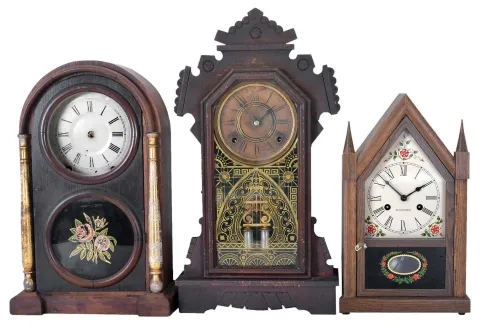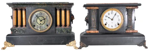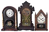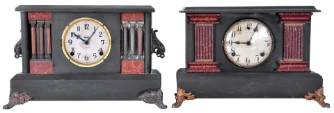 Clocks- 20 (Twenty) mantel and desk clocks: 3 (Three) black mantel clocks, 2 (Two) weight-driven ogee clocks, many wood cased mantel clocks, 2 (Two) Barr clocks for parts, a Seth Thomas chime clock, and a 400-day clock. Makers include Seth Thomas, Ansonia, Kundo, Barr, Waterbury, Ingraham, Chauncey Jerome, and H. Webster. sold "as is"