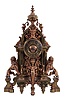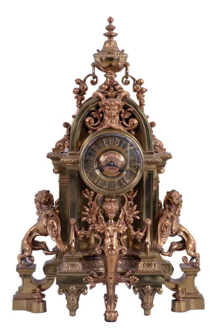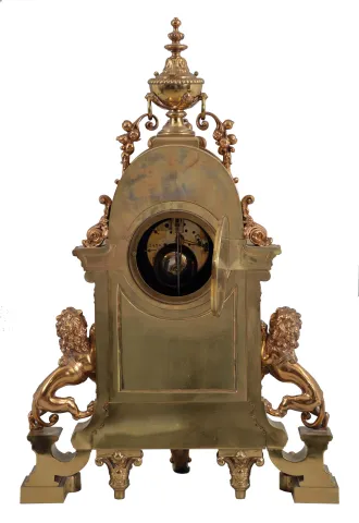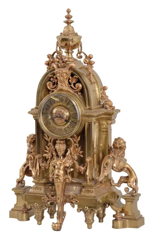 France, a large and imposing cast brass and bronze mantel clock, the base on tapered, scroll and cartouche ornamented feet, case front with niche containing a winged, half caryatid terminating in a foliate scroll, the sides with lions rampant guardant on pedestals, the top with bearded mask surrounded by foliate ornament and surmounted by an urn finial with flanking botanical pendants, Roman numeral dial with ornamental center, blued steel hands, 8 day, time and strike, pendule de Paris movement case originally with gilt and silvered surfaces, now polished to brass/ bronze, dial also polished, case back with minor staining, hands good, rear glass replaced and with glue residue, movement ticks and strikes