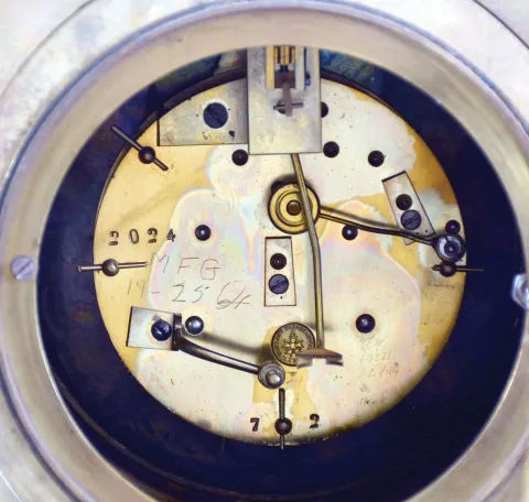 case originally with gilt and silvered surfaces, now polished to brass/ bronze, dial also polished, case back with minor staining, hands good, rear glass replaced and with glue residue, movement ticks and strikes