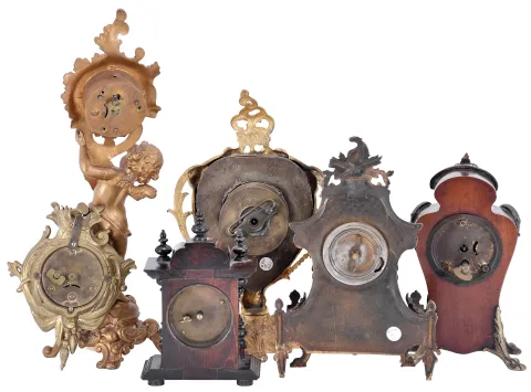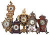 Clocks- 6 (Six): including an Ansonia figural with putto, an Ansonia cartel style, a Hamburg - American with gilt brass case set with porcelain panel featuring putti, a British United with gilt brass case, and two wooden miniatures two running, two others with good staffs