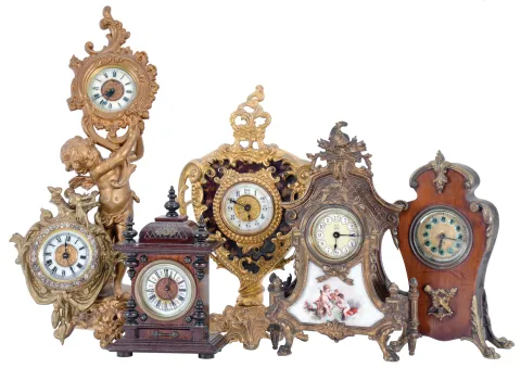 Clocks- 6 (Six): including an Ansonia figural with putto, an Ansonia cartel style, a Hamburg - American with gilt brass case set with porcelain panel featuring putti, a British United with gilt brass case, and two wooden miniatures