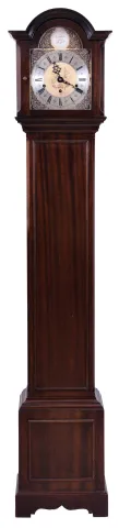 F.W. Elliot Ltd., Croydon, England, dwarf tall clock, 8 day, time, strike and chime playing Whittington and Westminster tunes, spring driven movement with balance wheel in a mahogany case with brass dial and silvered chapter ring, serial #15457 the clock is in excellent condition and ticks and strikes.