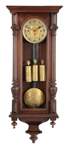 Clocks- 2 (Two): Both Vienna regulators, the first with veneered walnut case, ogee bottom bracket, door with applied half columns, arabic numeral silvered dial with sunk center, blued steel hands, and 8 day, quarter chiming, weight driven movement, the