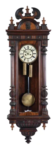 Clocks- 2 (Two): Both Vienna regulators, the first with veneered walnut case, ogee bottom bracket, door with applied half columns, arabic numeral silvered dial with sunk center, blued steel hands, and 8 day, quarter chiming, weight driven movement, the other with walnut veneered case, gadrooned bracket, door with applied half columns, and crest with carved and turned elements, Roman numeral white enamel dial, blued steel hands, and 8 day, time and strike, weight driven movement, dimensions of larger clock listed the first missing crest, minor veneer damage, dial with minor darkening, ticks and strikes, the other with veneer repairs, finish with scrapes and losses, dial and hands good, ticks and strikes, both for restoration, sold as is