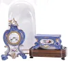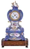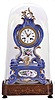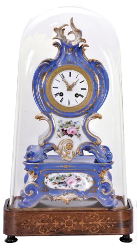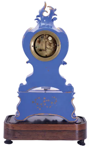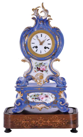 France, a two part, rococo style porcelain mantel clock with case in the style of Jacob Petit, the clock and stand both decorated with molded and brightly painted naturalistic ornament, blue ground highlighted by bright gilding, all resting on an inlaid rosewood base with dome, Roman numeral white enamel dial, unusual, fancy gilt trefoil hands, 8 day, time and strike, pendule de Paris movement with silk thread suspension, the back plate marked "Medaille d'or Japy" case and base very good, with minor wear and a tiny chip at top of case, minor losses to gilding, dial with hairline, hands very good, movement complete, does not tick or strike, very gummy, needs service, wooden base with wear and scratches, dome good