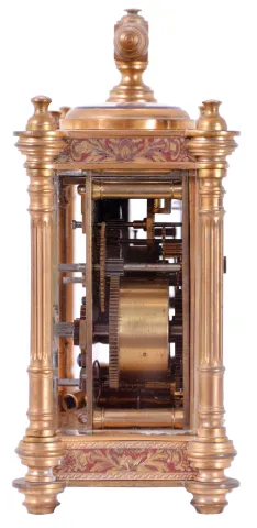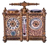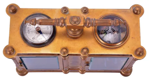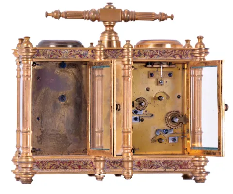 Victorian desk compendium of double carriage clock form, gilt brass case with turned feet, finials, and fluted columns, eight beveled glasses, and engraved panels with red enamel infill, the left side containing the clock, Roman numeral silvered dial, blued steel hands, 8 day time and alarm movement with lever platform, the right side with barometer and compass, both with silvered dials and blued steel indicators, case front also mounted with centigrade thermometer, case top with carrying handle case dirty and with losses to gilding and polish residue, clock, thermometer, and barometer dials with darkening, alarm dial with verdigris, thermometer replaced, movement runs briefly, alarm functional, would benefit from service