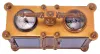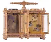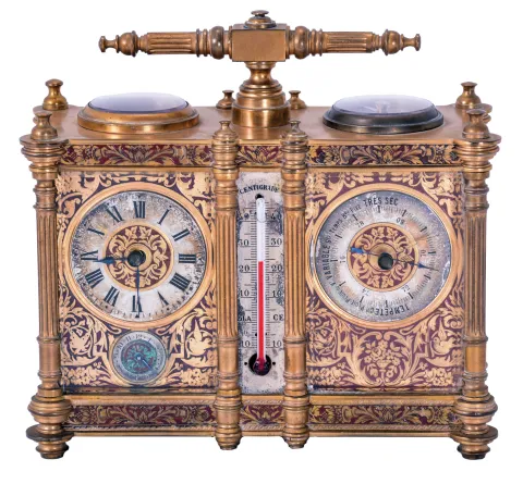 case dirty and with losses to gilding and polish residue, clock, thermometer, and barometer dials with darkening, alarm dial with verdigris, thermometer replaced, movement runs briefly, alarm functional, would benefit from service