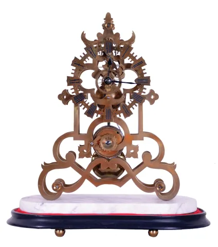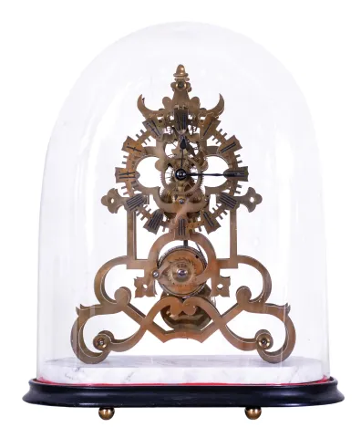 England, Skeleton clock, nicely pierced and finished brass scroll frames, Roman numeral skeletonized dial with shield shaped reserves for the figures, blued steel hands, 8 day fusee timepiece with 6 spoke crossings, recoil escapement, and brass pendulum with steel rod, all mounted to a marble plinth with ebonized wooden base, and with period shade frames with minor tarnish and polish residue, back cock replaced, dial lacking silver, dial feet replaced, hands painted black, ticking, pendulum replaced, base and dome not original to this clock