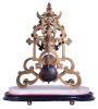 England, Skeleton clock, nicely pierced and finished brass scroll frames, Roman numeral skeletonized dial with shield shaped reserves for the figures, blued steel hands, 8 day fusee timepiece with 6 spoke crossings, recoil escapement, and brass pendulum