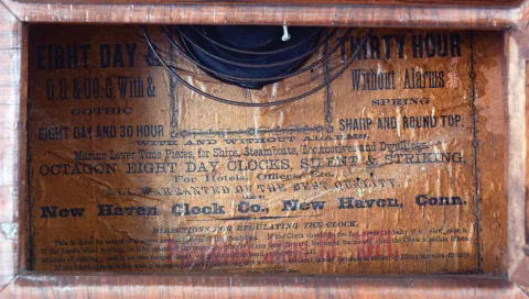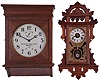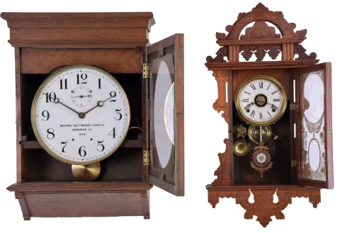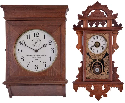 Clocks- 4 (Four): (1) Seth Thomas Clock Co., Thomaston, Conn., "Regulator No. 2" Reproduction wall hanging clock with a weight driven timepiece movement in an oak case, c1978; (2) New Haven Clock Co., New Haven, Conn., "12 Inch Drop Octagon Calendar" hanging clock with a spring driven, 8 day, time and strike movement with a simple calendar mechanism in a recently grain painted (over mahogany) case, c1900; (3) E. N. Welch Manufacturing Co., Bristol, Conn., "Donita" hanging clock with a spring driven, 8 day time and half-hour strike movement in a walnut case and manufactured for the Metropolitan Manufacturing Co., New York, c1885; (4) National Self-Winding Clock Co., Champaign, Ill., unidentified wall model battery clock in an oak case, c1905. (1) This clock was part (number 414 out of 4,000) of a reproduction run for this model by the Seth Thomas Clock Co. in 1976 in celebration of the Nation's Bicentennial.The clock is in excellent condition but does not have a weight; (2) The case has recently been grain painted. The dial has been repainted and the hands, while correct in style, appear to be later replacements; (3) The case has been stripped and refinished. The painted dial and hands are original. The stenciled door glass is correct for this model, but is a newer replacement; (4) The case has lost much of its original finish. The painted dial is in good condition and the hands appear to be original. Note: The dimensions are for clock number (1) .