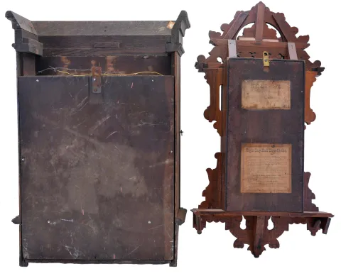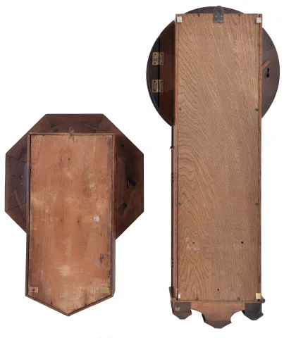 (1) This clock was part (number 414 out of 4,000) of a reproduction run for this model by the Seth Thomas Clock Co. in 1976 in celebration of the Nation's Bicentennial.The clock is in excellent condition but does not have a weight; (2) The case has recently been grain painted. The dial has been repainted and the hands, while correct in style, appear to be later replacements; (3) The case has been stripped and refinished. The painted dial and hands are original. The stenciled door glass is correct for this model, but is a newer replacement; (4) The case has lost much of its original finish. The painted dial is in good condition and the hands appear to be original. Note: The dimensions are for clock number (1) .