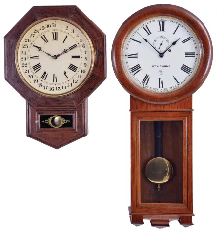 Clocks- 4 (Four): (1) Seth Thomas Clock Co., Thomaston, Conn., "Regulator No. 2" Reproduction wall hanging clock with a weight driven timepiece movement in an oak case, c1978; (2) New Haven Clock Co., New Haven, Conn., "12 Inch Drop Octagon Calendar"